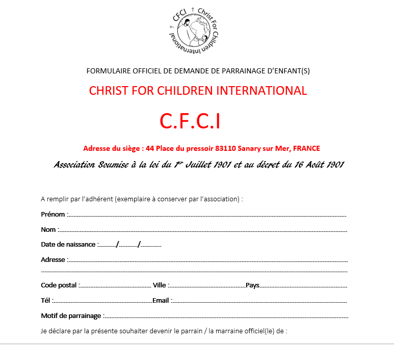 PARRAINEZ UN ENFANT ET PARTICIPEZ A SON EDUCATION EN REMPLISSANT LE FORMULAIRE OFFICIEL DE DEMANDE