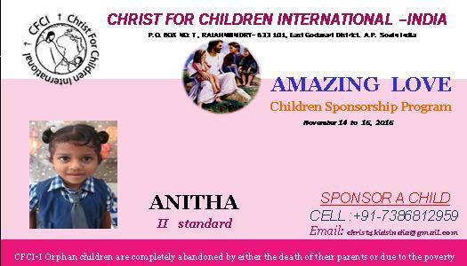 "Hello, i am CHARKRAVARTHY Baviri, i turned my heart and life over to Jesus-Christ, and was born again. I married an orphan girl, her name is Clara. God called me with a broad mind and vision so we commited our lives for the preaching, teaching, caring orphans, disabled and HIV/AIDS kids and glorifying our Lord Jesus-Christ. It is a privilege to meet you through this website. I would like to introduce myself as an ordained Pastor and director of CFCI INDIA ministries registred and it has operating since 1995 on faith basis working among tribal, rural and slum area of Andra Pradesh, Telangana, Orissa and Chattisgarh states in India. I thank God almighty and every donators who support us. Thank you very much. Blessings."
